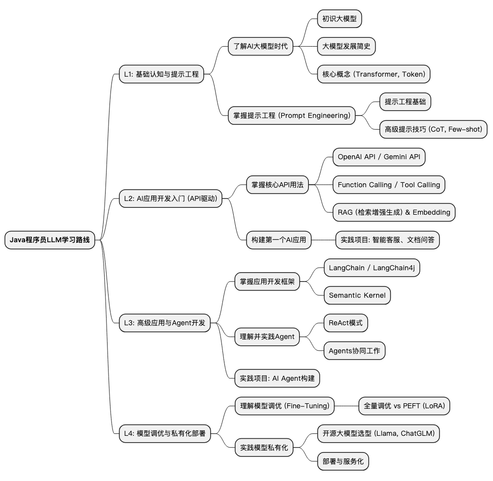从掌握提示工程,到API应用开发,再到构建复杂的Agent,最后到模型的私有化部署,这条学习路线为Java程序员提供了一条清晰、可行的路径来拥抱AI大模型时代。