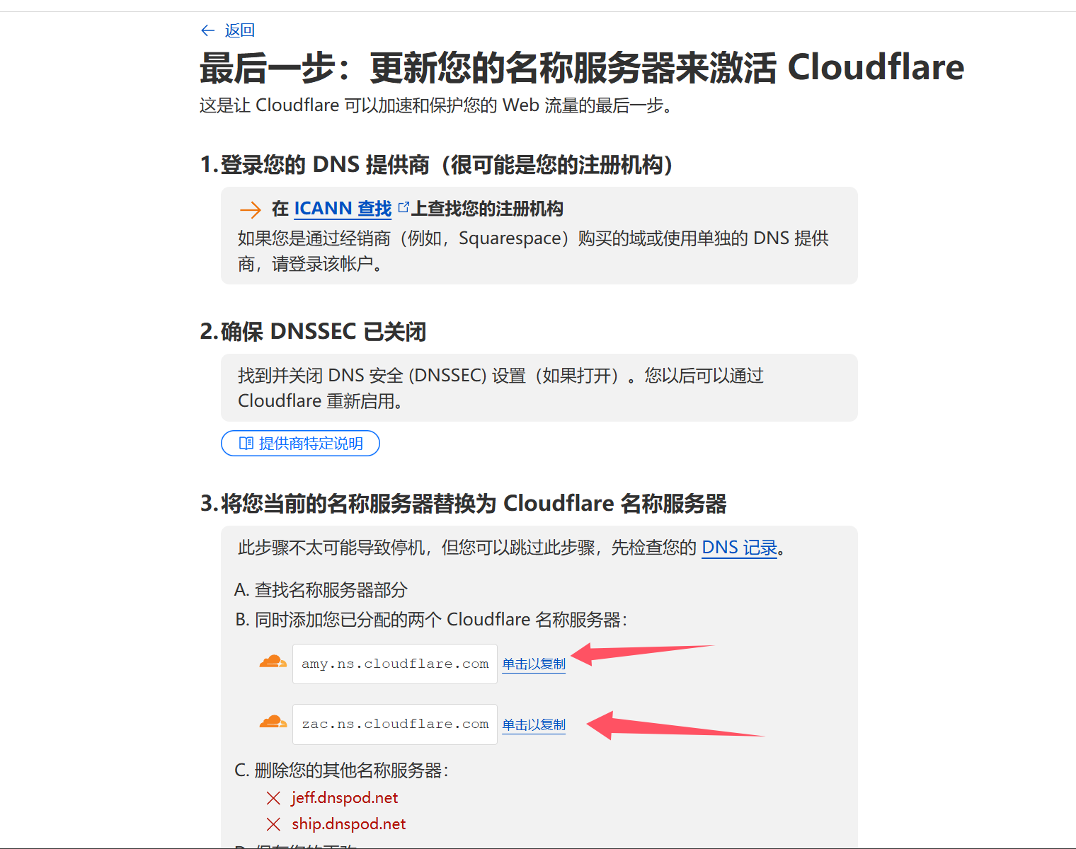 根据提示前往你的域名注册商,然后更改 NameServer 地址为Cloudflare的DNS服务器