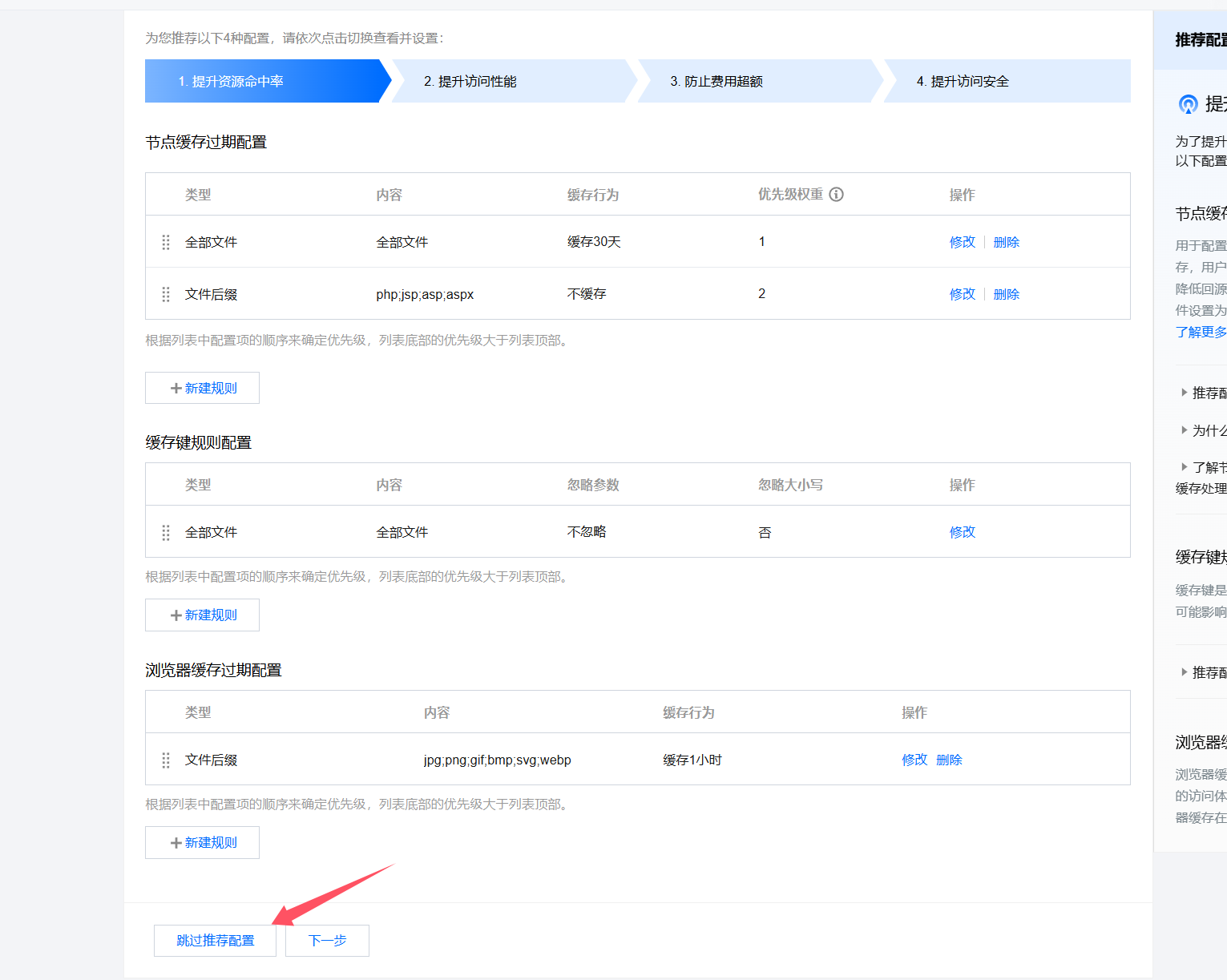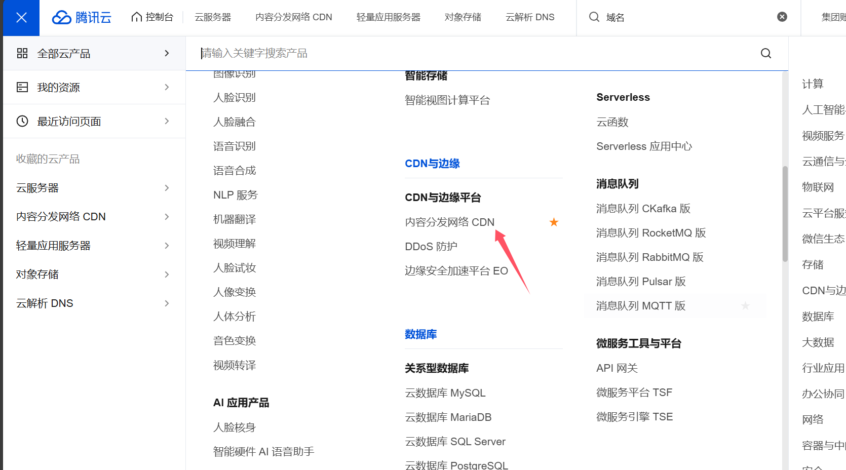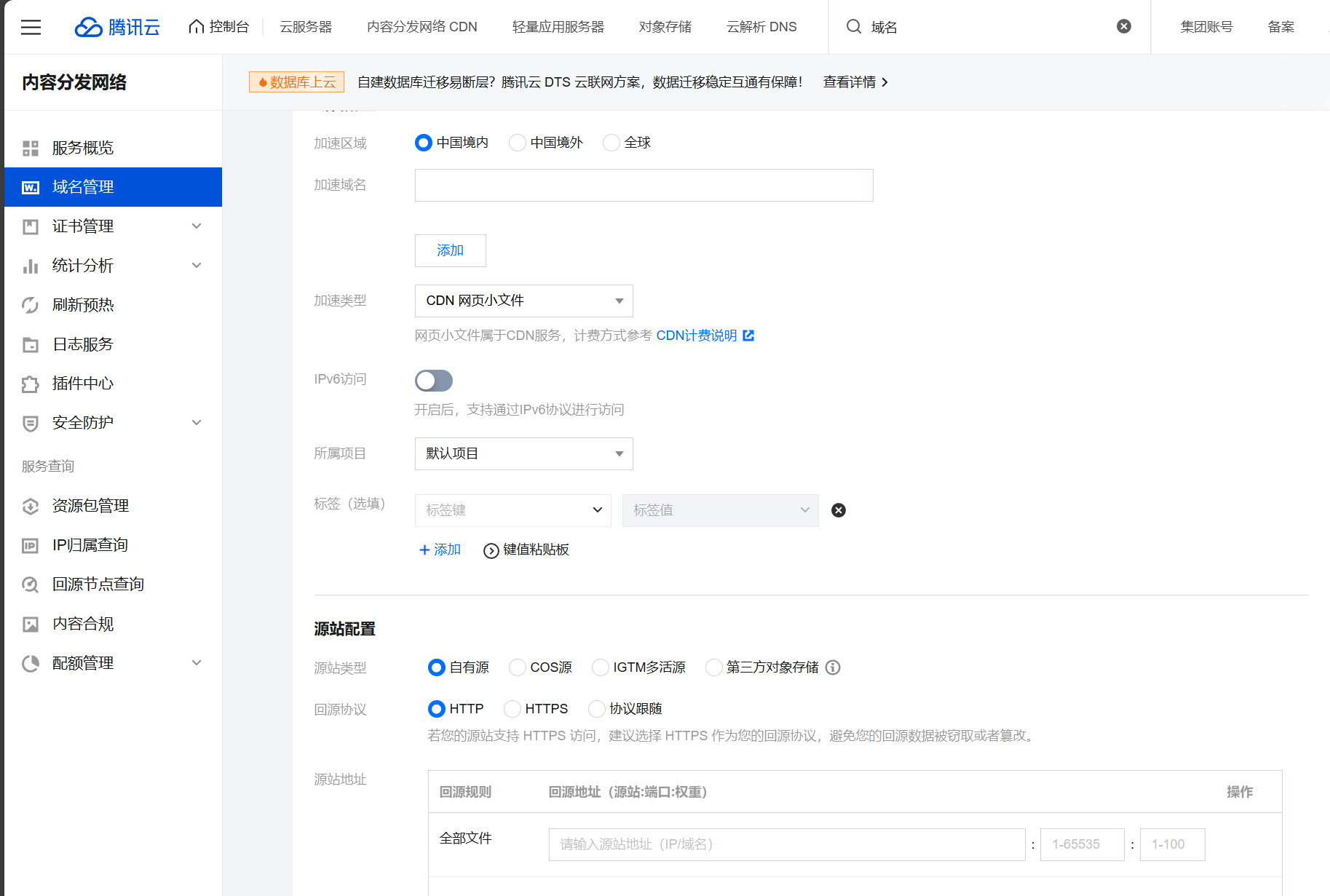 进入域名管理→点击添加域名,加速域名 填写用户要实际访问的域名,源站 选择自有源,地址 填写你的服务器ip,点击下一步。