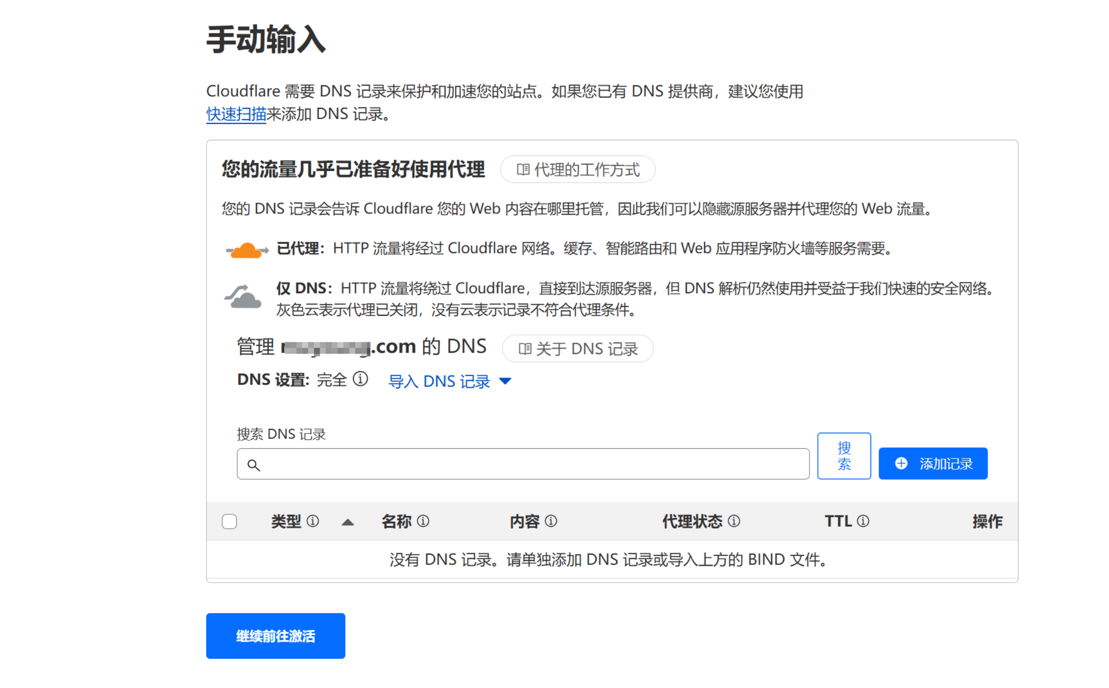 Cloudflare会扫描域名已有的解析信息(一般新注册的域名是空白内容),点击 继续前往激活
