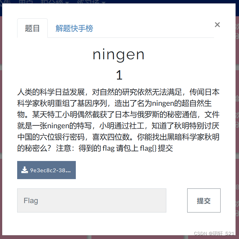-u 表示只显示破解出来的密码,其他错误的密码不显示出5、使用密码解压,得到ningen.txt文件,打开文件得到flag。