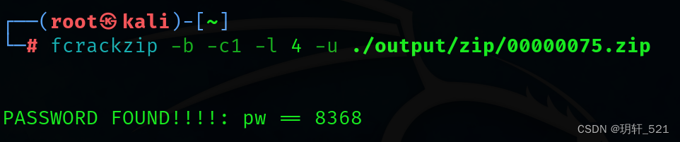 4、尝试解压zip压缩包,需要密码。根据题目信息,密码为四位纯数字,使用fcrackzip破解zip压缩包的密码,得到密码为8368。