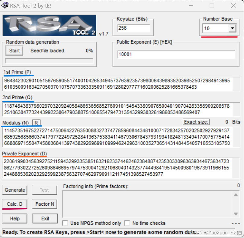 print(n)3、将Q、P、N的值,填入适当的位置,点击Calc.D按钮,算出D。 (如果给出的是N和E的话,输入N和E,点击Factor N(分解),得到P,Q,再重复第3步就能得到D了)