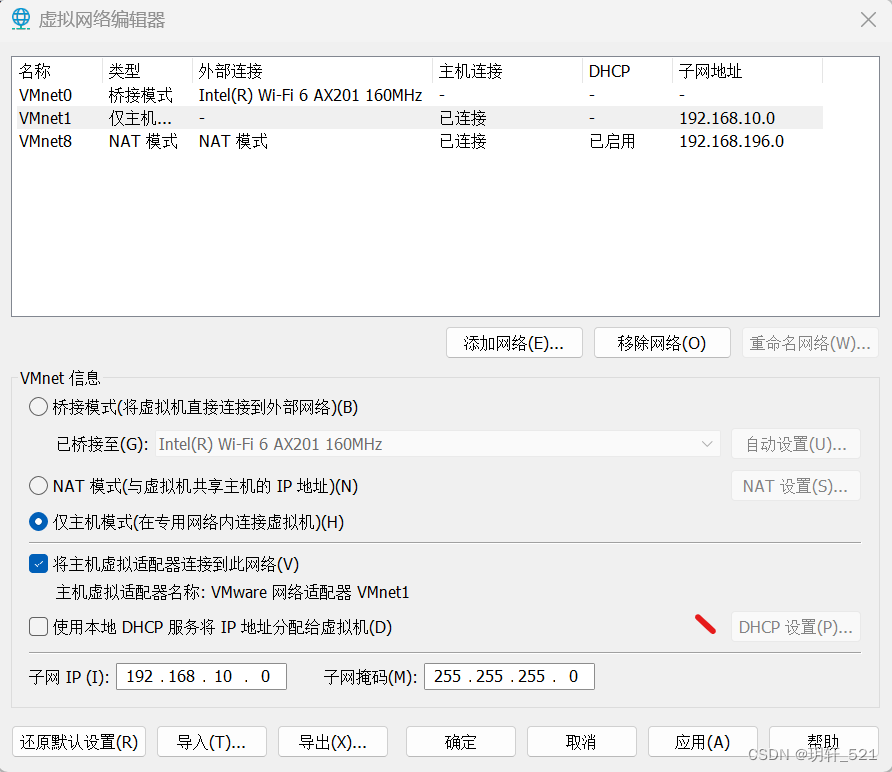 在虚拟机关闭的情况下,vmware虚拟网络编辑器,设置子网网段为192.168.10.0