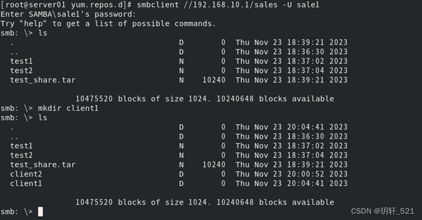 [root@server01 yum.repos.d]# smbclient // 192.168.10.1/sales -U sale1