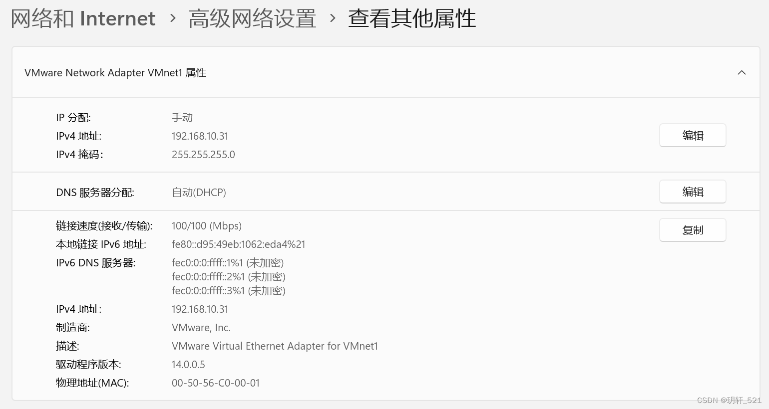 (Windows11客户端)设置>>网络和Internet>>高级网络设置>>找到网卡VMnet1>>查看其它属性>>编辑