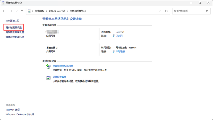3、进去后,选择更改适配器设置