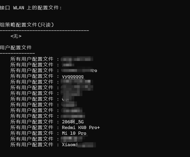 这里面记录了所有链接过的WI-FI密码,如果想查看某一个的密码,就输入:netsh wlan show profile name=你的网络名 key=clear。