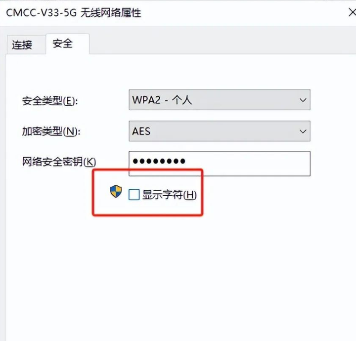 再选定“安全”,勾选“显示字符”,便能看到连接该 WIFI 的完整密码了。