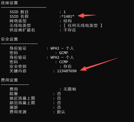 输入:netsh wlan show profile name=1401 key=clear