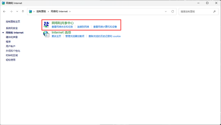 2、找到“网络和 Internet”,点击进入并选取“网络和共享中心”