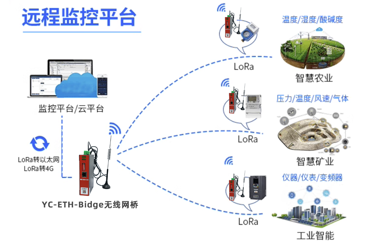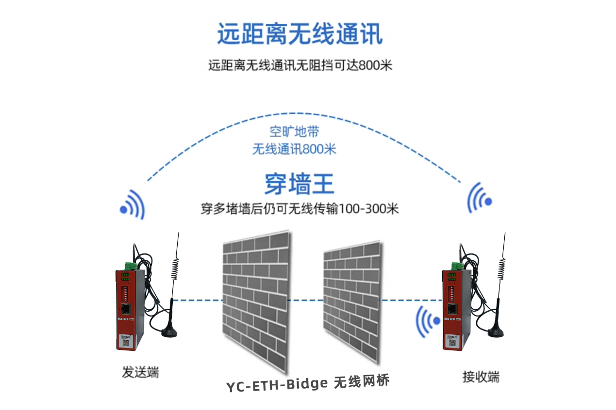 远创智控4系工业级无线通信装置YC-ETH-Bridge-300,具备RS232和RS485接口,无线可靠传输距离达20KM,支持点对点及点对多点通信,适用于分散不便布线场景。无需编程和布线,外接220V电源及信号线即可实现混合信号无线通讯,野外可采用太阳能供电,能省去挖沟布线时间及后期维护费用。