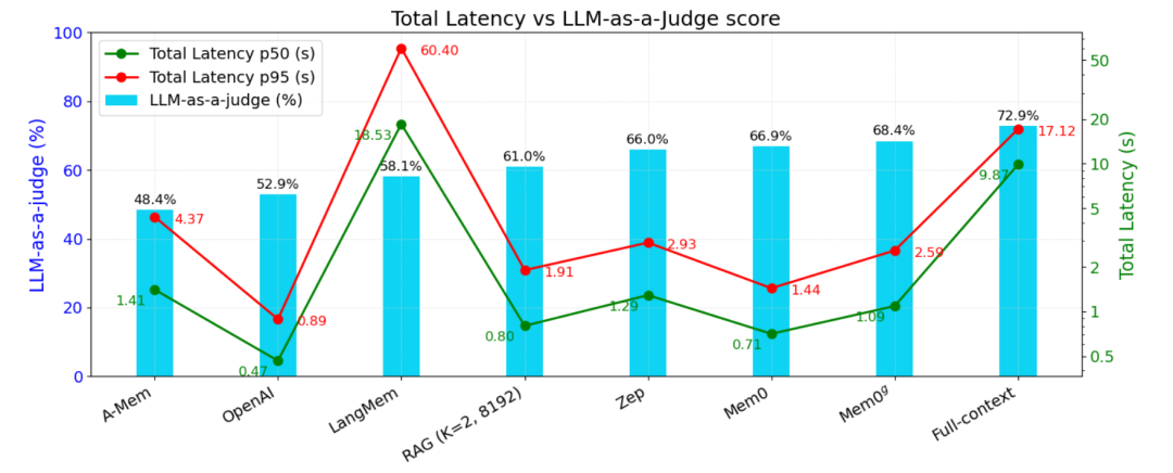 下图是不同记忆方法在 p50 和 p95 的总响应延迟比较,其中包括了大模型推理在内的延迟。