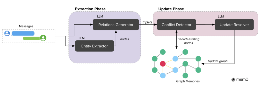 引入基于图的记忆后,提取阶段利用大模型将对话消息转换为实体和关系三元组;更新阶段在将新信息整合到已有知识图谱时,采用冲突检测与解决机制。