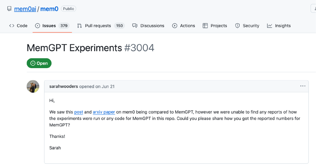 6 月时候,Sarah 在 GitHub 上询问 Mem0 是如何获得 MemGPT 的相关数据的,但没有回应。