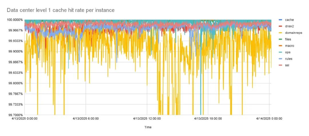 添加第二缓存层后,可以在数据中心内解决的键的百分比显著提高。表现最差的实例具有高于 99.99% 的缓存命中率。所有其他实例的缓存命中率高于 99.999%。
