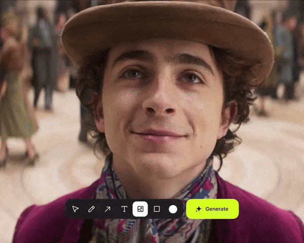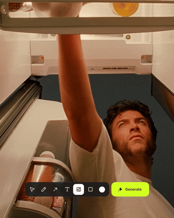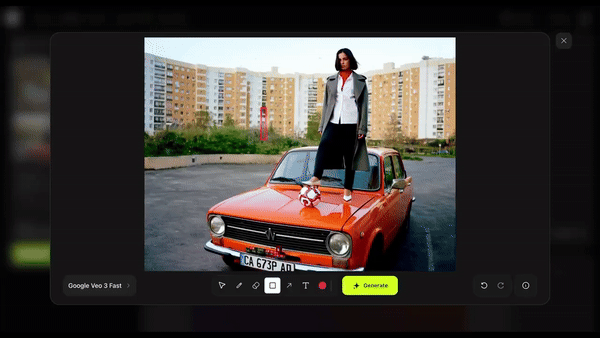 然后直接在画面上绘制箭头、图形等元素,并输入动作指令,比如「演员跑进来」、「这里爆炸」或「镜头移动」,AI 会立即执行,并生成极具真实感的动态画面。