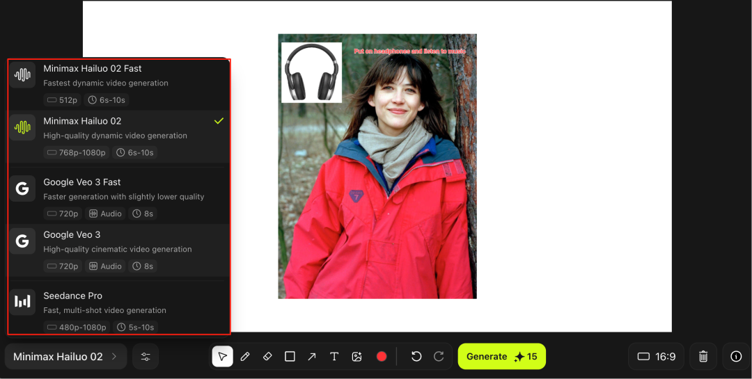 1. 它支持谷歌 Veo 3、字节 Seedance、MiniMax Hailuo02 等视频生成模型,无需切换不同平台,只在一个界面就能完成图像和视频的创作。