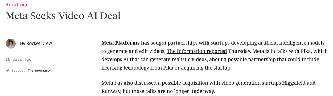据 The Information 报道,Meta Platforms 正在寻求与开发人工智能视频生成与编辑模型的初创公司建立合作关系,曾与视频生成初创公司 Higgsfield 探讨过潜在的收购事宜,但这些谈判目前已不再进行。