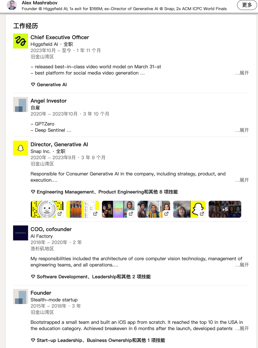 而更早之前他创立的图像和视频识别公司 AI Factory 以 1.66 亿美元的金额被 Snap 收购。