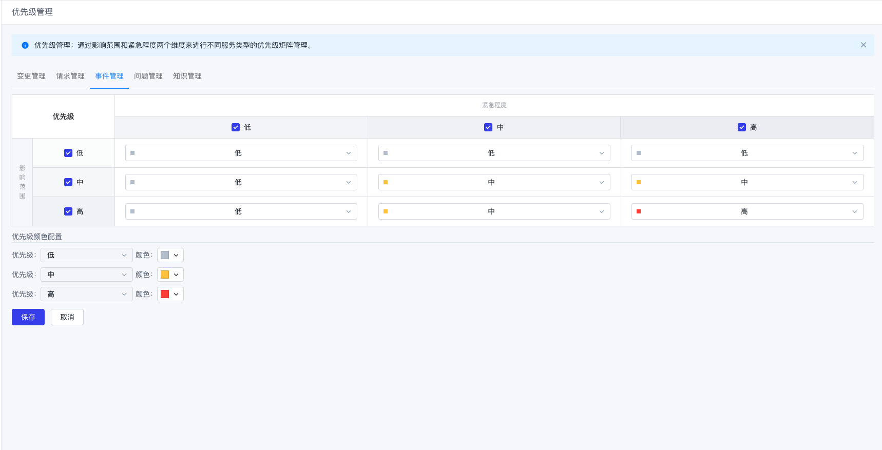 通过“影响范围”和“紧急程度”两个维度来定义不同类型服务的优先级。