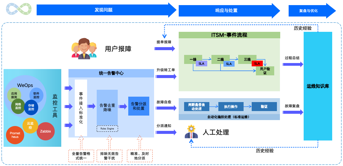WeOps不仅限于ITSM,致力于实现IT服务、IT流程与运维管理融合的一体化解决方案。