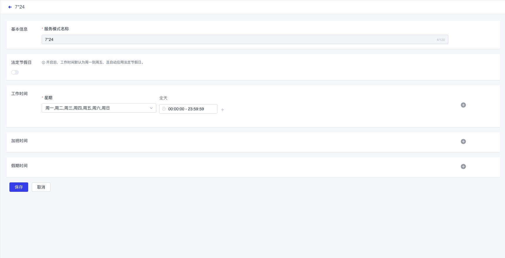 通过正常工作时间、加班时间、休假时间三个维度来设置服务模式。