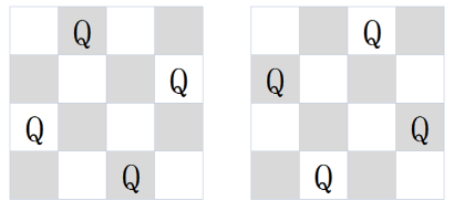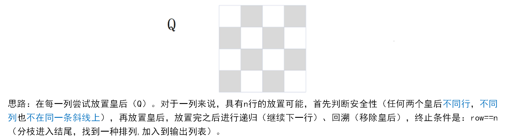 N皇后的摆放问题可以通过回溯算法完成。具体操作为:在每一列尝试放置皇后(Q)。对于一列来说,具有n行的放置可能,首先判断安全性(任何两个皇后不同行,不同列也不在同一条斜线上),再放置皇后,放置完之后进行递归(继续下一行)、回溯(移除皇后)。