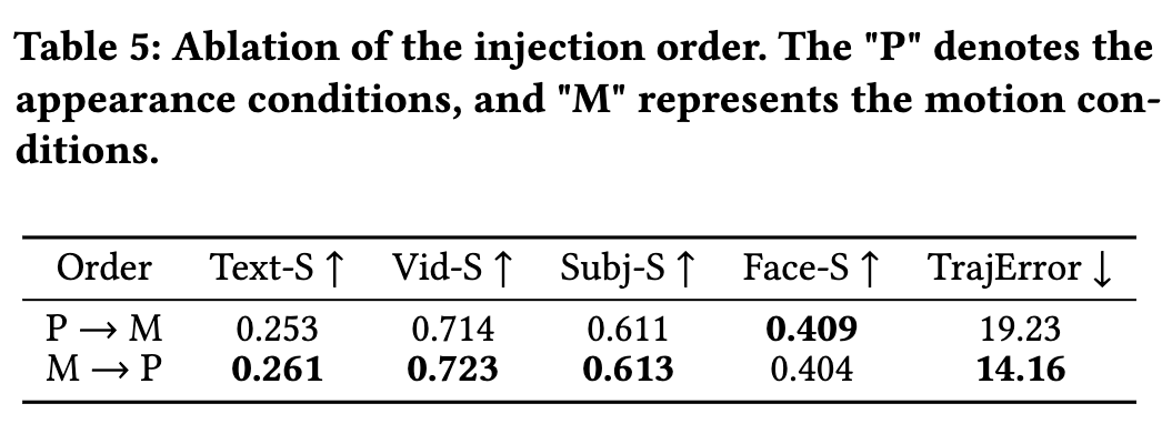 通过自适应层归一化和交叉注意力注入运动与个性化嵌入被证明是最有效的方式。我们在保持这些先进设计的同时探索特征注入顺序。下表5显示:过早注入个性化嵌入会轻微降低运动跟踪保真度,因为交叉注意力机制对风格化身份特征的过度激活会抑制运动轨迹语义在扩散过程中的传播。因此我们最终选择运动-文本-个性化的注入顺序,该安排确保:运动嵌入先建立时序动态,文本条件维持语义完整性,最后个性化嵌入在不牺牲轨迹精度的情况下增强外观特征。
