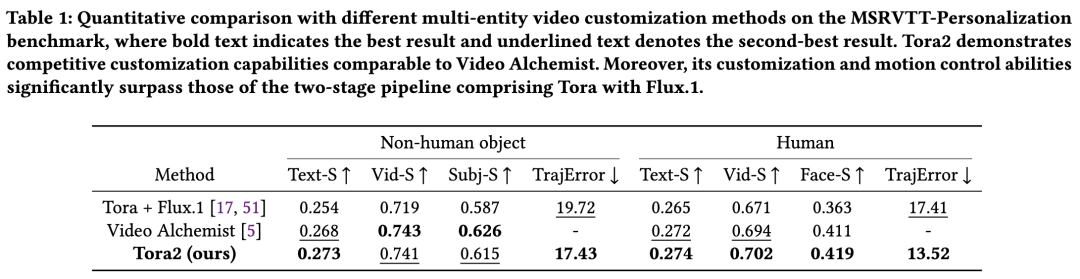 下表1展示定量评估结果。为消除基础模型差异带来的不公平比较,构建了基于Flux.1+Tora-I2V流程的基线方法。