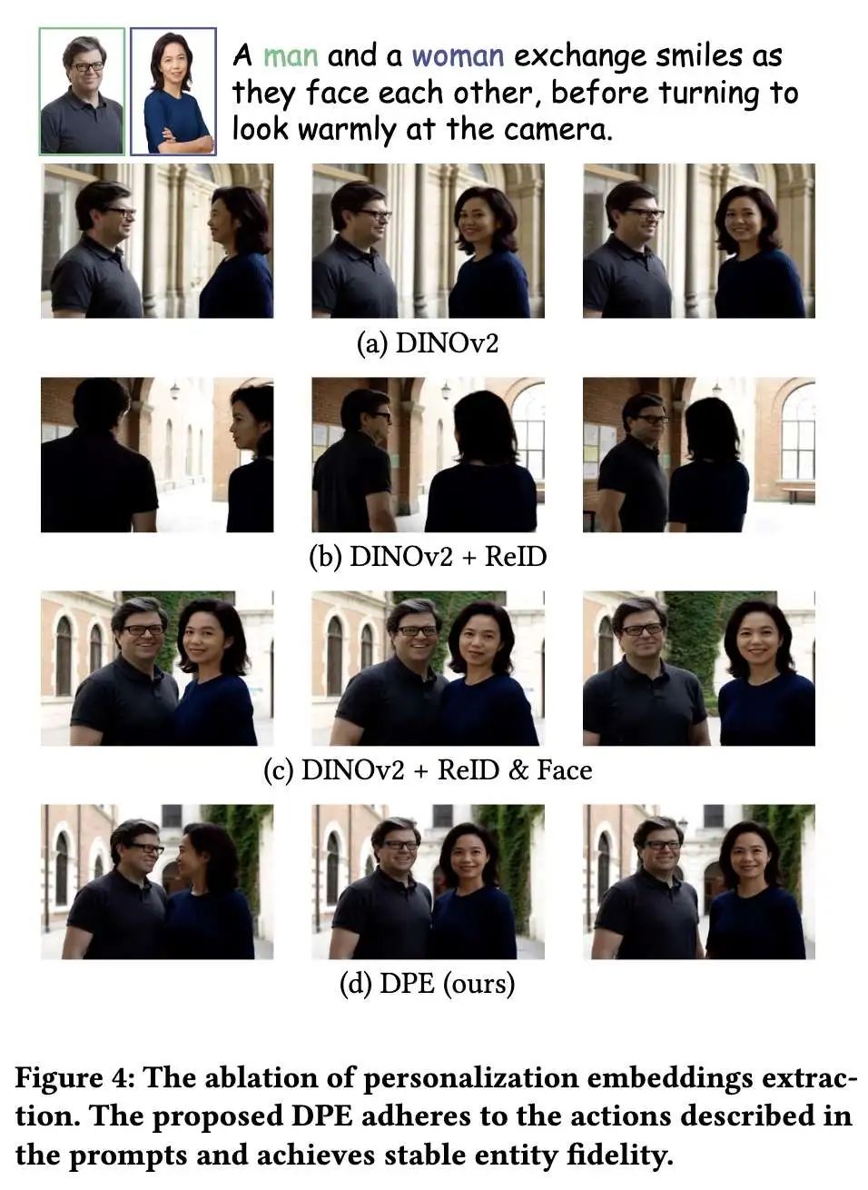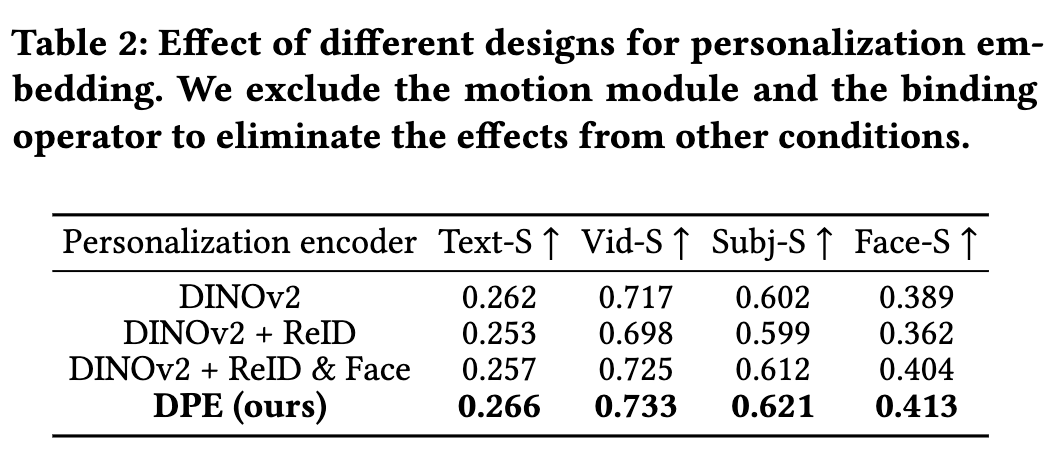 个性化嵌入提取的不同设计 为评估解耦个性化编码器的有效性,本文对比了四种嵌入提取方法:(a) 使用DINOv2图像编码器的低频全局特征(如Video Alchemist);(b) 通过线性投影合并全局特征与ReID模型的高频特征;(c) 通过线性投影合并全局特征与ReID/人脸识别模型的解耦高频特征;(d) 采用本文DPE,通过Q-Former架构查询拼接嵌入。下图4和表2展示了定性与定量结果。