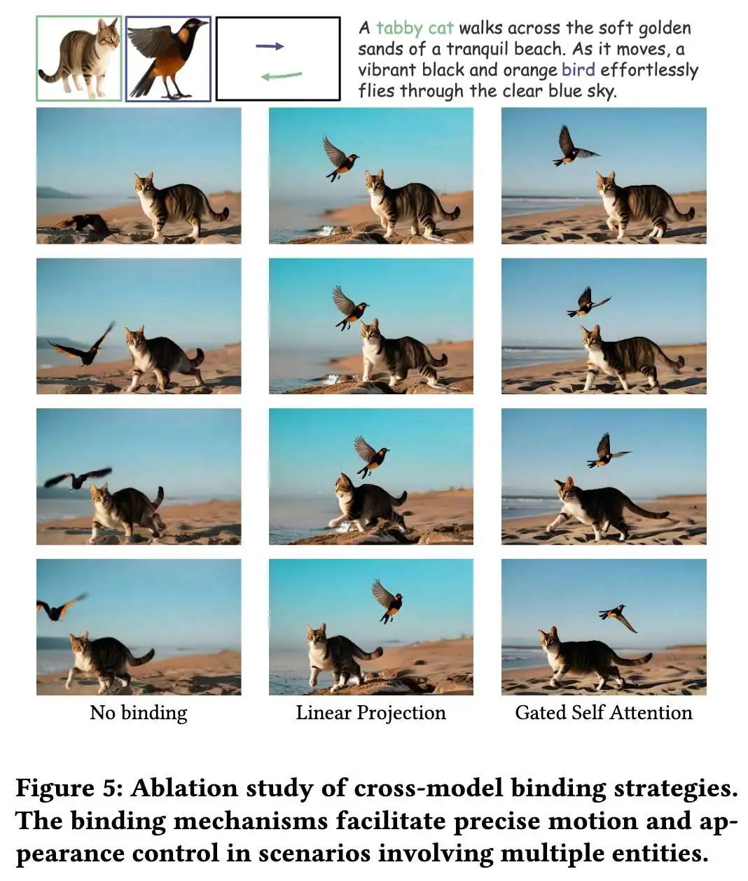下表3显示,缺乏显式实体绑定的基线架构轨迹对齐偏移增加12.6像素,主体相似度下降1.5%。如下图5所示,无绑定策略时鸟的轨迹错误转为相机右移。线性投影变体虽能关联轨迹-实体-文本,但视频相似度下降1.0%(视频后半段猫和鸟出现形变)。本文门控注意力架构在保持保真度的同时实现了最优的实体-轨迹绑定。