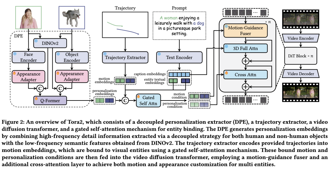 Tora2——一个支持多实体运动轨迹控制的统一视频生成框架。Tora2通过解耦个性化提取器,在Q-Former框架下融合语义特征与高频本质特征,实现开放集个性化嵌入提取;采用新颖的绑定策略关联视觉实体、运动轨迹与文本词汇,确保多实体间的协调控制。大量实验表明,Tora2在保持与最先进定制方法相当性能的同时,提供了更先进的运动轨迹控制能力,显著提升了可控视频生成的现有技术水平。