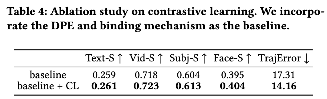 下表4定量验证了我们的对比学习策略。通过优化隐空间中个性化嵌入与运动模式的相对距离,该方法在保证多实体属性解耦的同时,促进其在给定运动条件下的和谐融合,使轨迹跟踪精度提升约3.2像素偏移量,同时提高约1.0%的身份保持保真度。