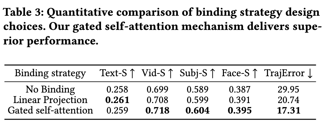 多模态特征绑定的效果 本文通过三种架构变体验证实体绑定机制:(a) 直接向DiT块注入个性化嵌入;(b) 沿通道维度拼接个性化嵌入、运动嵌入和文本特征后线性投影;(c) 本文门控自注意力机制动态调节三模态特征交互。