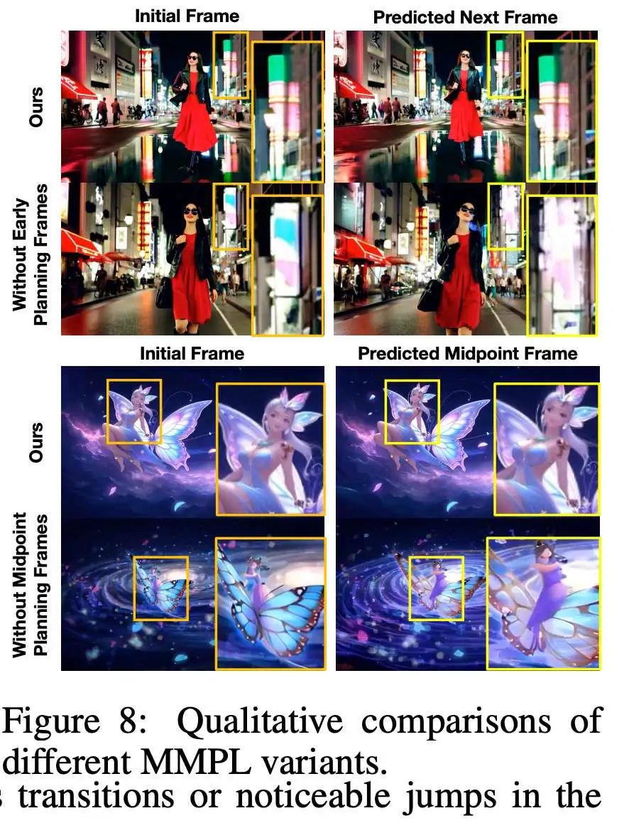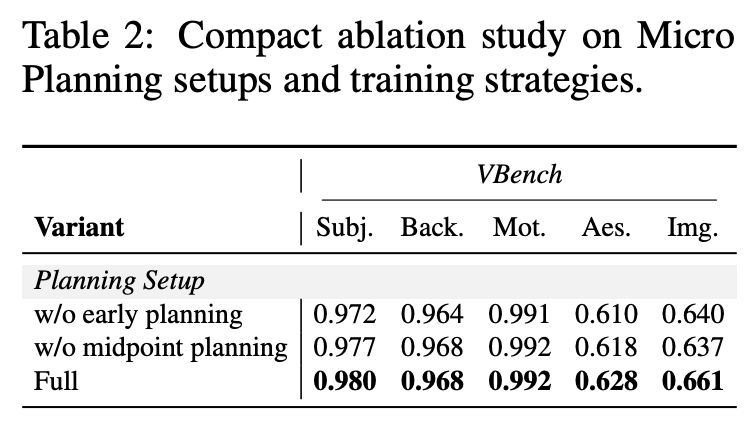 消融研究。在长视频生成中,微观规划阶段规划帧的放置位置对MMPL整体性能至关重要,因其直接影响时序平滑度和结构一致性。为验证该假设,进行三种微观规划变体的消融实验:(i) 无早期帧规划(省略初始时间步附近的帧);(ii) 无中点帧规划(移除中心锚点帧);(iii) 完整MMPL策略(保留所有规划帧)。如下表2所示,完整MMPL配置在所有指标上均优于其他变体。此外,如下图8定性对比显示,完整MMPL策略不仅产生更平滑的时序过渡和更稳定的长时内容,而其他变体因缺失特定规划帧,在对应位置易出现不连续过渡或明显跳帧。
