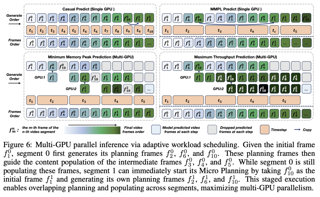 不同片段的内容填充可在多GPU上并行执行。但该方法存在一个关键限制:必须等待所有片段的规划帧完全生成后才能开始并行化,这会引入不可避免的前缀延迟,降低整体流水线吞吐量。为进一步提升生成效率,我们提出自适应负载调度策略,动态调整微观规划、宏观规划和内容填充的执行顺序以最大化并行性。具体而言,宏观规划被构建为片段级微观规划的自回归链,这自然强制了跨片段规划帧的严格生成顺序。该特性允许在早期片段的规划帧就绪后立即启动其内容填充,而无需等待所有后续片段的规划帧完成。