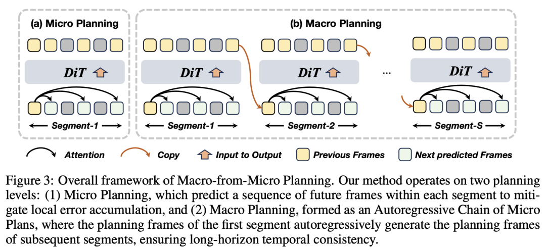 宏观规划。虽然微观规划提供了片段级的时间故事情节,但在捕捉整个视频的全局依赖关系方面仍有局限。为实现长程连贯性,将微观规划扩展为宏观规划。宏观规划通过顺序链接跨视频片段的重叠微观规划,为整个长视频构建全局故事情节。一个片段的终止预规划帧作为下一个片段的初始条件,从而将局部规划连接成连贯的长时结构,这可视为视频时间线上的片段级自回归过程。设帧长为的完整视频被划分为个短片段,第个片段的首帧记为,该过程可表示为: