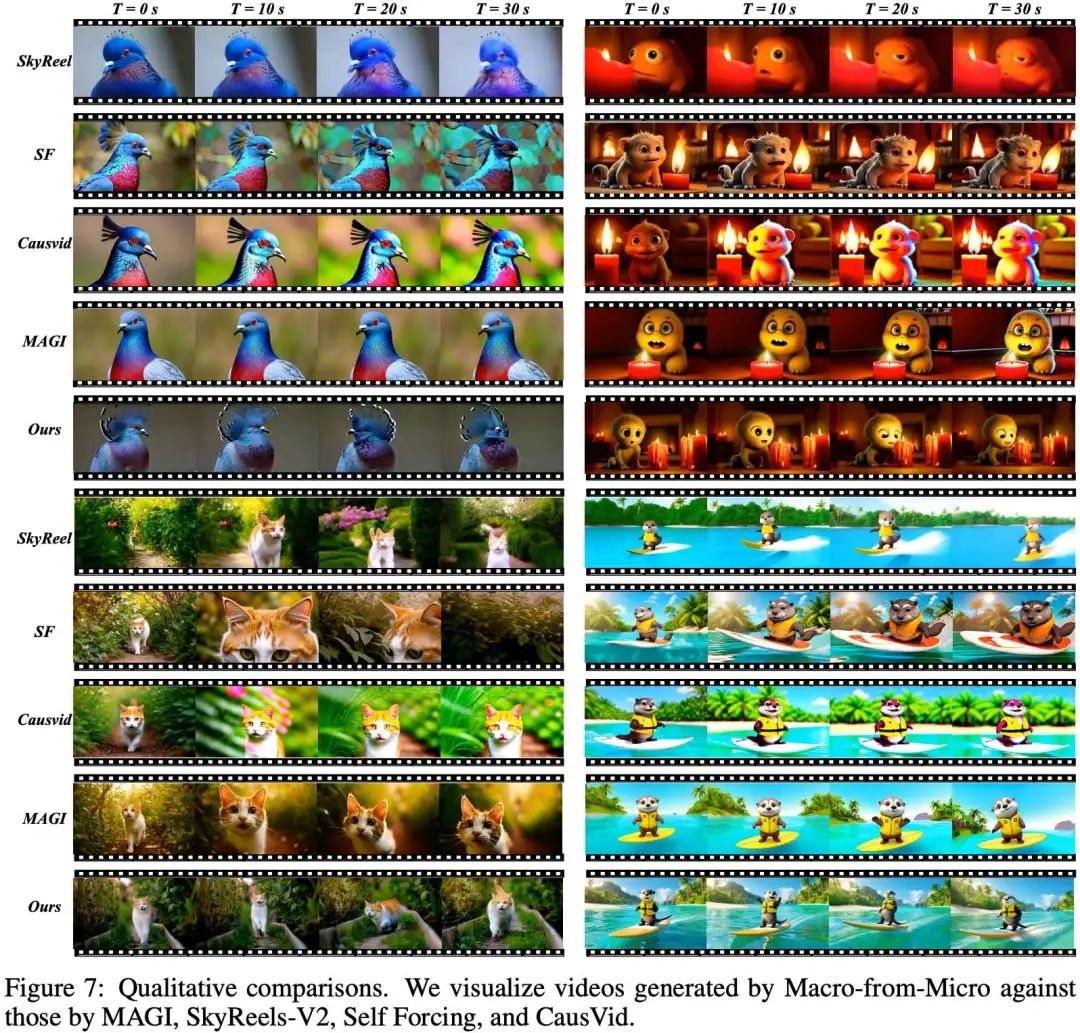 与自校正方法的兼容性。Macro-from-Micro与Self Forcing等逐步自回归误差校正策略互补。训练时模型通常基于真实视频帧去噪预测下一帧,若将真实帧替换为先前预测帧,可自然过渡至Self-Macro-from-Micro模式。该混合策略能进一步延长可生成视频时长,并显著提升长序列的时间一致性。