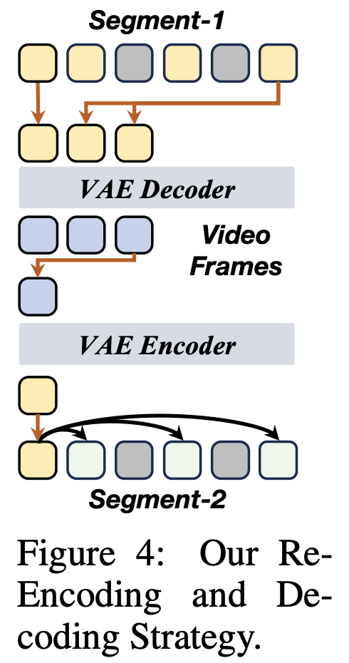 受[CausVid Yin et al. 2025]启发,本文引入抗漂移的重新编码-解码策略来稳定片段间过渡。如下图4所示,首先将前一片段的初始潜在标记与其终止规划标记拼接,并将序列输入VAE解码器进行视频重建。但由于VAE解码要求每个标记必须以严格连续的时间前缀为条件,输入序列中的任何时间不连续性都会导致明显的色彩偏移和边界伪影。为缓解该问题,我们将终止规划标记复制一次,并将副本插入初始潜在标记与原终止规划标记之间,形成时间连续的潜在序列以供解码。重建后,我们重新编码终止规划标记的第二个副本,并将生成的潜在标记作为下一片段微观规划的初始标记。该设计在潜在空间强制实现统计和时间一致性,有效抑制色彩偏移和边界闪烁,实现平滑稳定的片段间过渡。