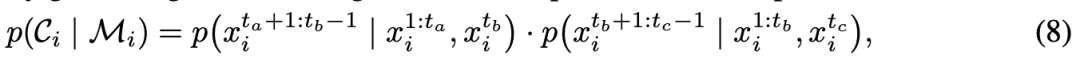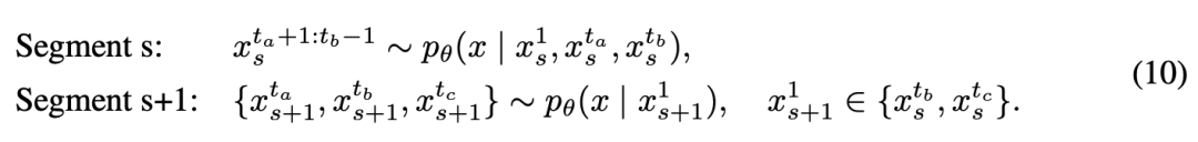 其中对应第个片段中待合成的帧。变量、和分别表示第片段的早期、中点和终止规划帧。符号和表明每个子片段的生成不仅以其边界规划帧为条件,还依赖于同一片段中所有先前的帧。因此,两个子片段中的中间帧和表示待填充的剩余内容。