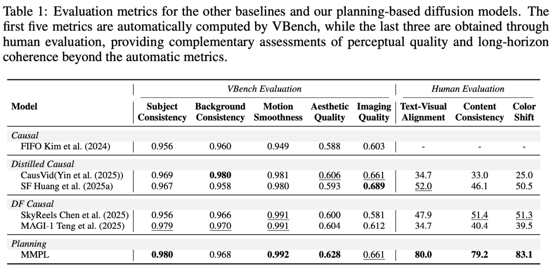 训练细节。在Wan2.1-T2V-14B(基于双向DiT的流匹配模型,原设计用于5秒视频生成)上实现MMPL。为实现高效长时建模,训练时采用FlexAttention实现可扩展注意力,推理时使用FlashAttention-v3加速采样。模型在50,000条人工筛选的832×480分辨率高质量视频上微调,提供多样且干净的训练数据以支持稳定优化和长时生成。使用AdamW优化器在32块H100 GPU上训练8,000次,学习率为。分层规划中设置、和,分别对应指导片段生成的早期、中点和晚期规划帧。