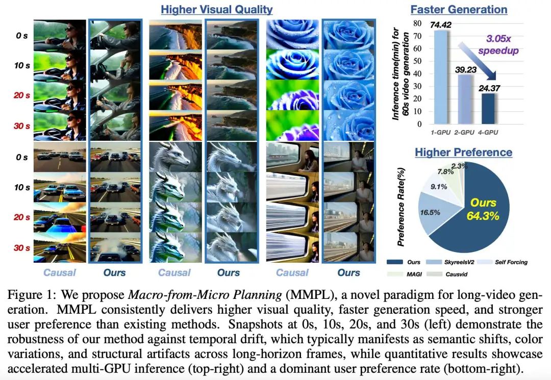 并行推理效率。为突出Macro-from-Micro规划的实际优势,本文比较其标准推理与并行化变体。并行策略在不损失生成质量下实现显著加速。如上图1所示,本方法将60秒视频生成时间大幅缩短,展现强扩展性和实时部署适用性。仅用2块GPU即可减半推理时间,借助流水线设计,4块GPU进一步将生成时间降至原时间的约三分之一。这些结果证实本方法有效平衡吞吐量与质量,其硬件效率使其高度适合大规模视频合成应用。