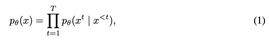 自回归(AR)模型。自回归(AR)模型通过概率链式法则分解联合概率分布来生成序列: