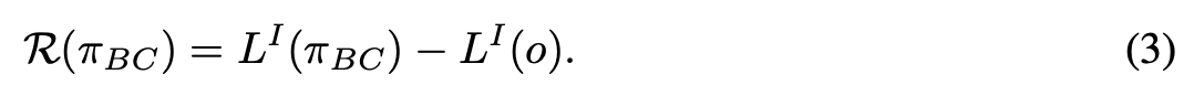 在模仿学习文献[Ross et al. 2011]中,执行通过行为克隆训练的策略通常会导致误差累积。这是因为策略是在自身预测而非训练时看到的最优状态上执行的。为了分析这种效应,本文使用推理时遗憾度来衡量行为克隆策略与最优策略在轨迹执行过程中的性能差距: