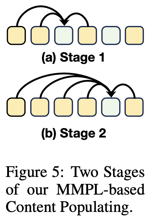 微观规划自然地将每个视频片段划分为两个子片段,由连续的规划帧界定,例如和。为了在这些规划帧的约束下通过填充剩余帧来合成完整片段,本文引入基于MMPL的内容填充。微观规划生成三种类型的规划帧:早期帧、中点帧和终止帧。受早期基于首尾帧生成视频的方法启发,将内容填充过程分为两个阶段,如下图5所示。
