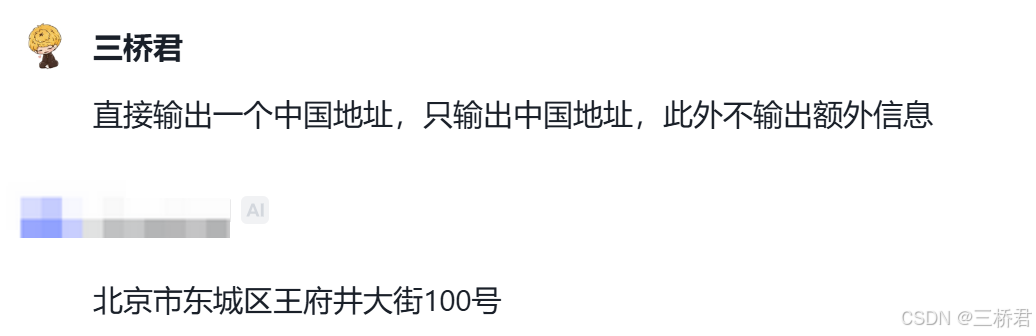 直接输出一个{data},只输出{data},此外不输出额外信息,输出示例: {example}比如,我想生成中国地址,我不想给例子,直接让模型自由发挥,我就这么写: