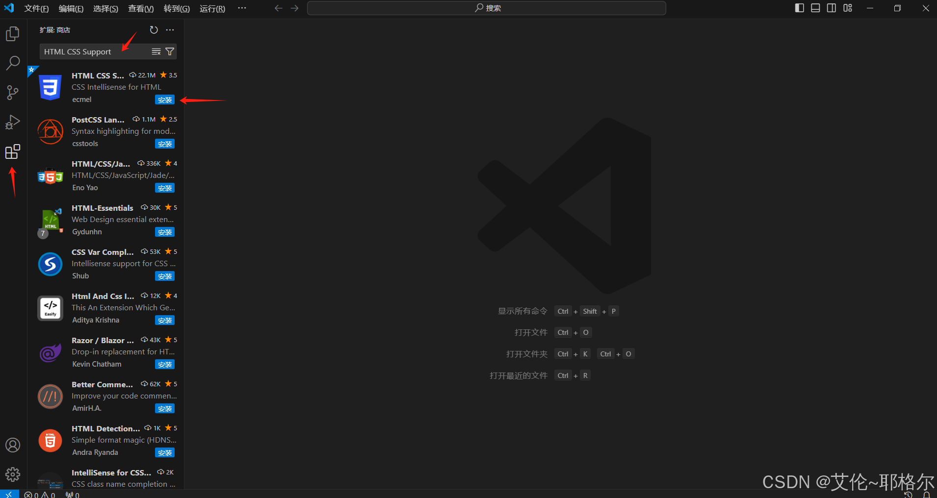 点击四个小方框图标,输入HTML CSS Support,点击install,进行安装