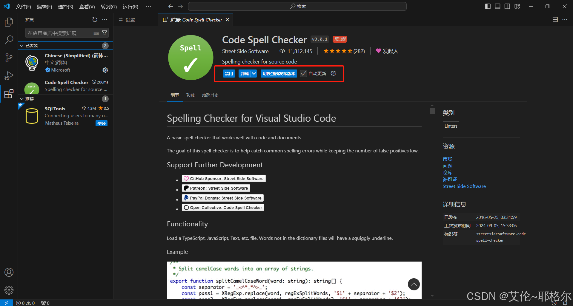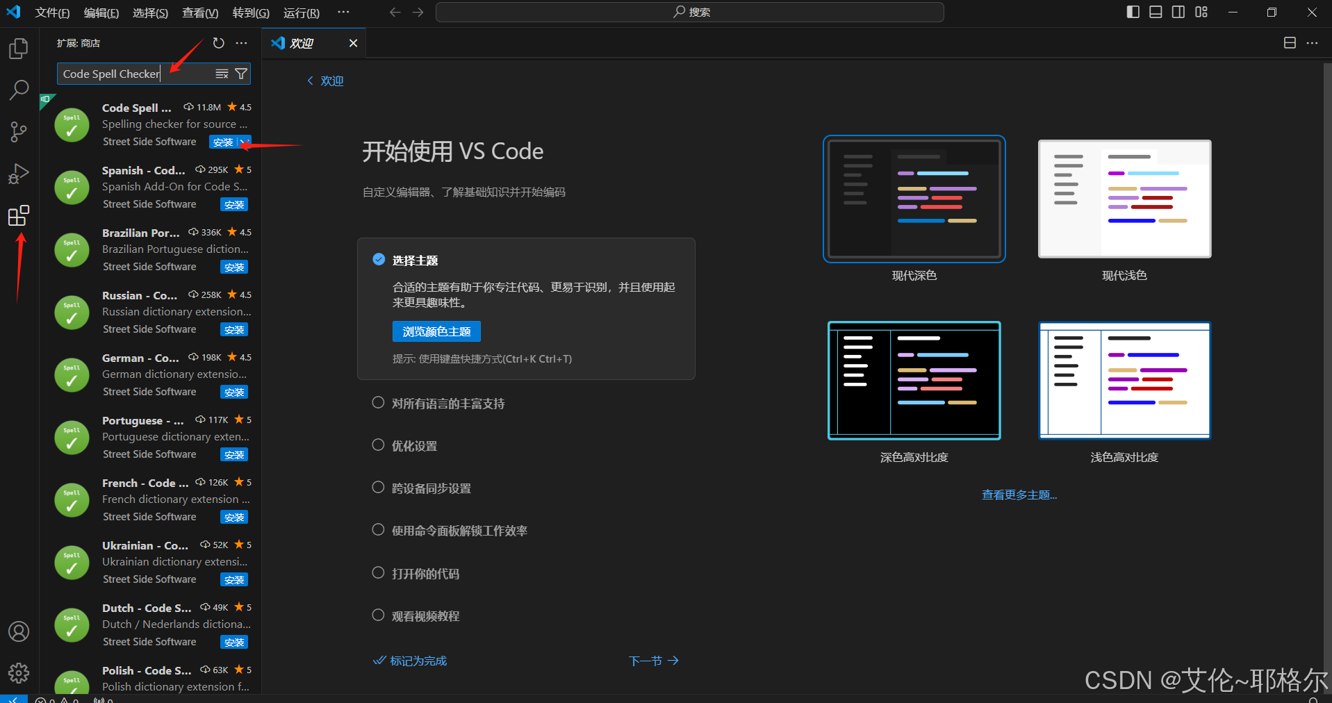 点击四个小方框图标,输入Code Spell Checker,点击install,进行安装