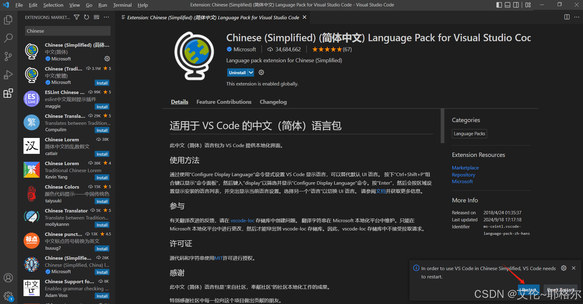点击四个小方框图标,输入Chinese,点击install,进行安装